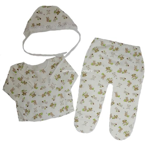 Комплект состоит из распашонки с рукавчиками трансформерами и с кнопочкой на одной стороне, ползунков на резинке, чепчика. Все швы у набора выполнены наружу. Расцветки в каждой партии отличаются.