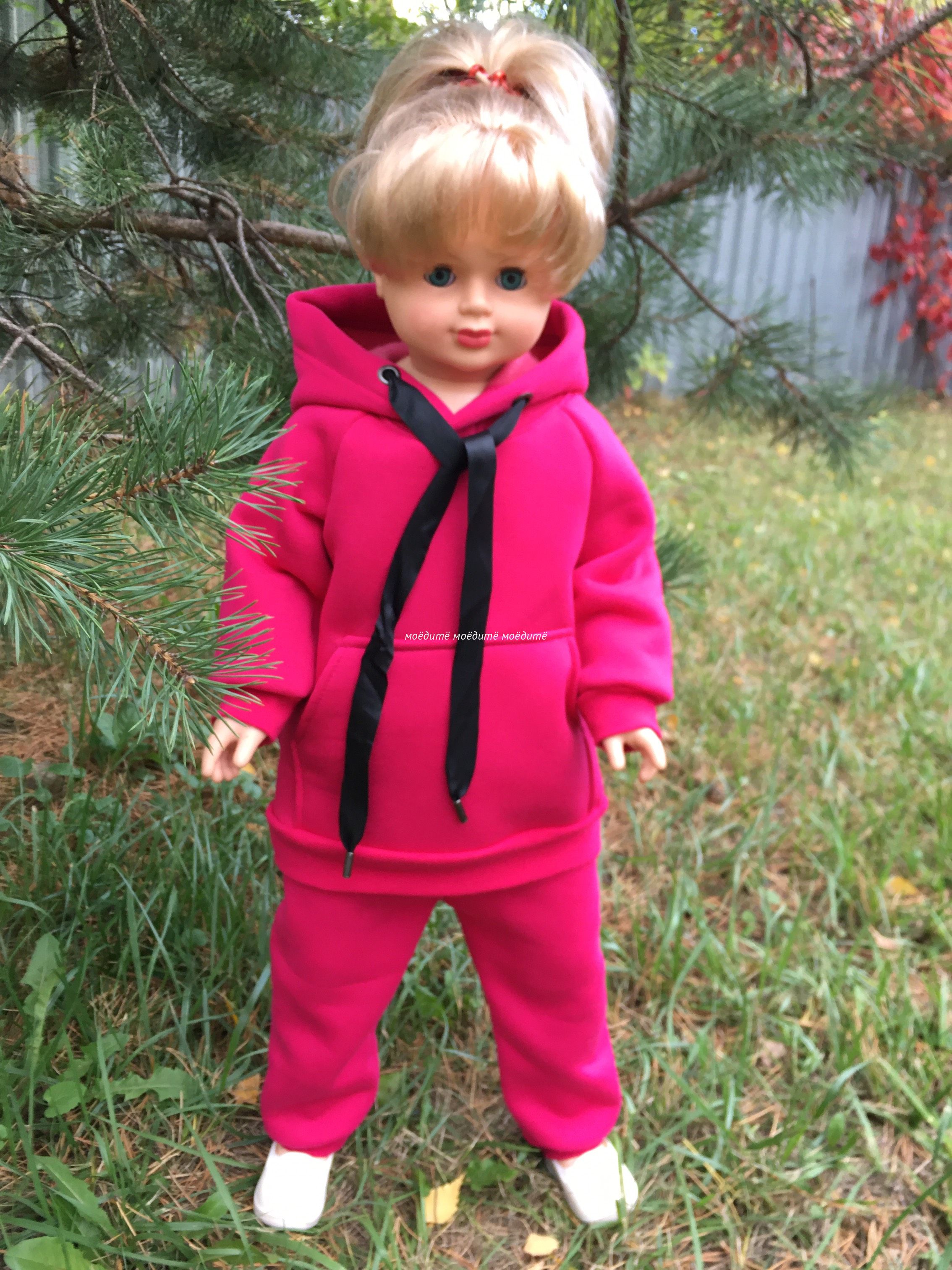 Костюм выполнен из футера трёхнитки с начёсом. Костюм состоит из толстовки с капюшоном, спереди с карманом "кенгуру", на рукавах манжеты. В комплект входят брюки сверху на широкой резинки, снизу на манжетах. И толстовка и брюки декорированы шнурком.