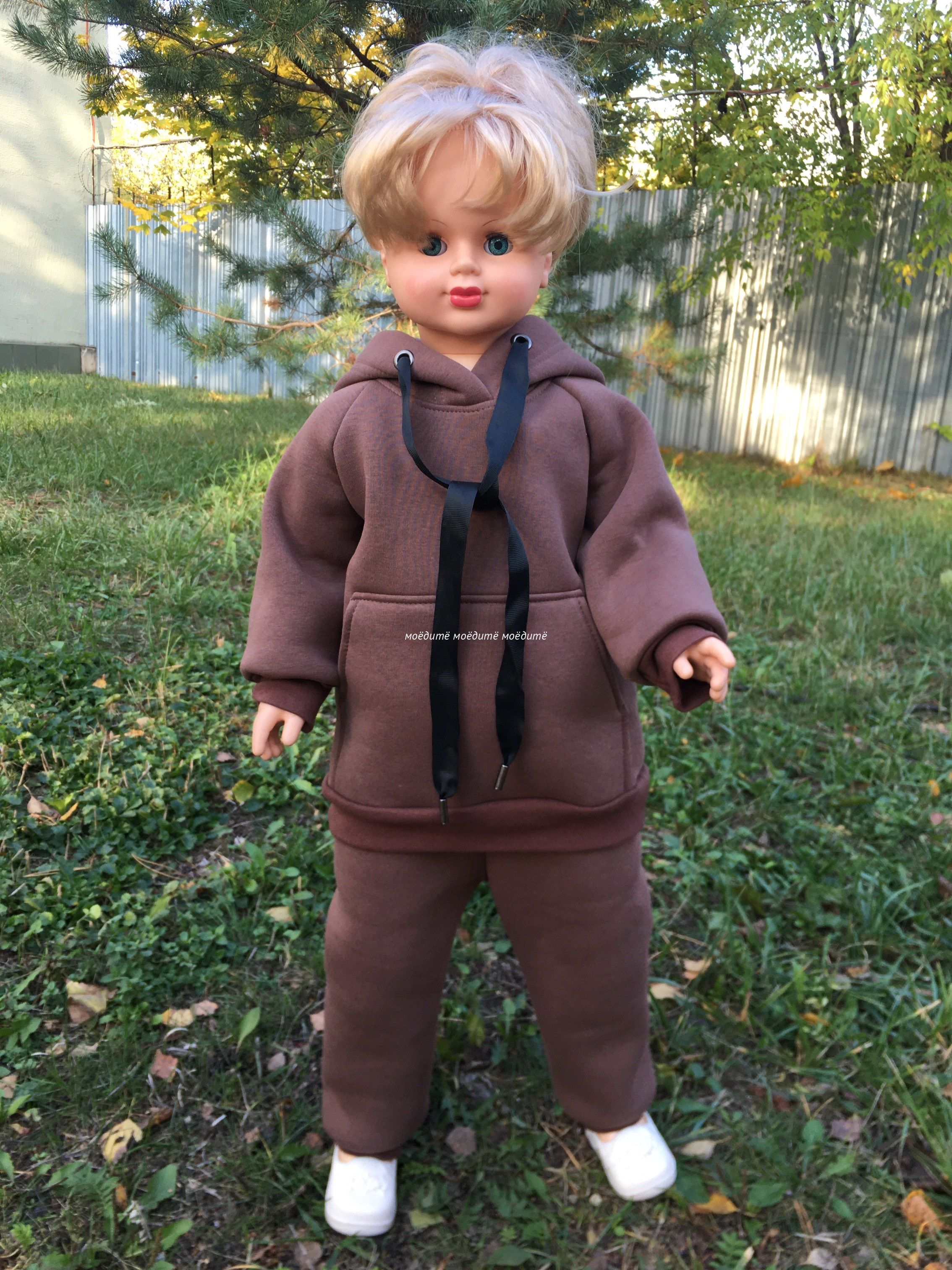 Костюм состоит из джемпера снизу на манжете и рукава также на манжете, в качестве застёжки идут кнопочки на одно плече. Перед и спинка джемпера из велюра, рукава выполнены из велсофта. Спереди джемпер украшен персонажами из мультиков. Штанишки из велсофта, на резинке, с лампасами, снизу на манжете.