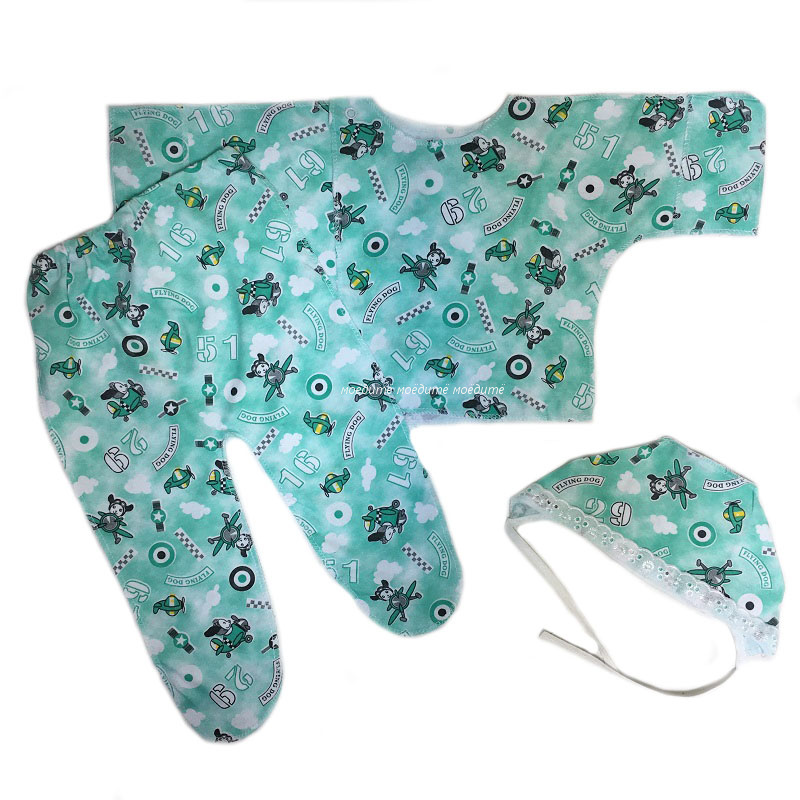 Комплект состоит из распашонки с рукавчиками трансформерами и с кнопочкой на одной стороне, ползунков на резинке, чепчика. Все швы у набора выполнены наружу. Рисунки в каждой партии отличаются.